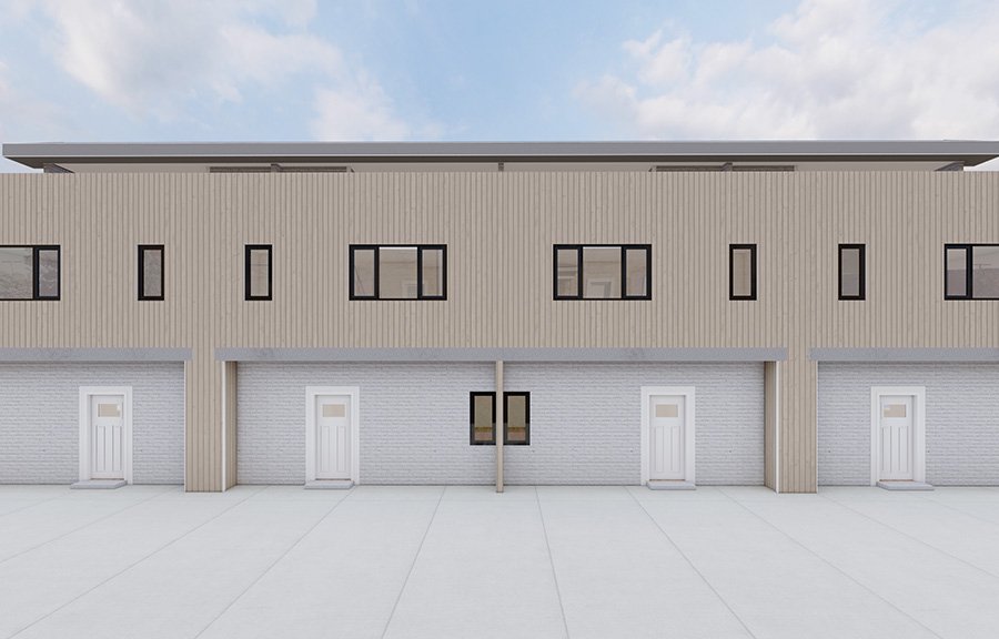 Cada unidad ofrece aproximadamente 1.148 pies cuadrados de espacio interior y está diseñada como una residencia de dos pisos que brinda la comodidad, privacidad y sensación de una townhouse. El primer piso cuenta con una amplia sala de concepto abierto (Great Room), una cocina moderna con electrodomésticos nuevos, gabinetes y amplia superficie de mesones, grandes ventanales que permiten abundante luz natural, un baño (medio o completo, según el plano) y acceso directo al estacionamiento trasero. El segundo piso incluye dos habitaciones de tamaño completo con clósets, un baño completo con acabados modernos, una escalera central que facilita la circulación y un espacio designado para lavandería y equipos mecánicos según las especificaciones del proyecto. Además, el proyecto incorpora un tercer nivel parcial (como se muestra en la lámina A1.2), que ofrece espacio adicional para equipos mecánicos o almacenamiento, con potencial para convertirse en oficina o bodega según las aprobaciones finales.